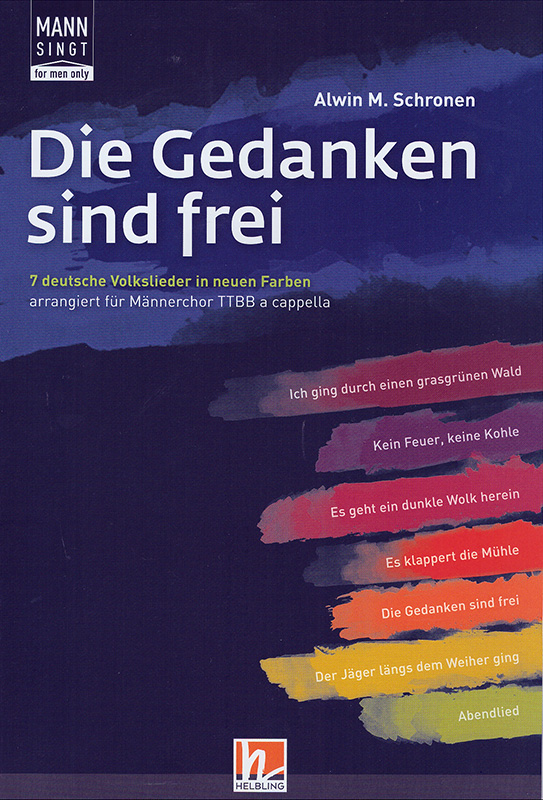 In der vorliegenden Männerchorsammlung hat Alwin M. Schronen sieben Volkslieder aus Deutschland ausgewählt, die in ihrer Intention und Stimmung nicht unterschiedlicher sein könnten. Mit Sachverstand und großer Kenntnis der Männerstimme hat er Arrangements geschaffen, welche die Geschichten in den Volksliedern in neuen Farben erstrahlen lassen. Hierzu hat er eine breite Palette an Stilmitteln angewendet: von der nicht zu unterschätzenden Einstimmigkeit über zweistimmige Passagen bis zum vollen Männerchorklang, von Vokalisen, die tonmalerisch in die Strophen einstimmen, bis zu spannenden Tempowechseln bei durchkomponierten Stücken. Auch populäre Klänge finden sich in seinen Arrangements und eröffnen so auch