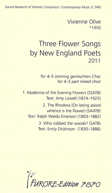 Vivienne Olive (*1950) studierte Klavier, Cembalo, Orgel und Musiktheorie und promovierte im Fach Komposition. Ihr Werk umfasst mehr als 60 Kompositionen, unter anderem die Oper "Das hässliche Entlein" (Uraufführung 2010) mit einem Libretto von Doris Dörrie, die im Rahmen eines Internationalen Kompositionswettbewerbs an der Hochschule für Musik Köln in Zusammenarbeit mit der Oper Köln im Jahr 2004 entstanden war. "Three Flower Songs by New England Poets" ist in der Reihe Sound Research of Women Composers: Contemporary Music bei Furore erschienen und verarbeitet Gedichte von Amy Lowell, Ralph Waldo Emerson und Emily Dickinson.