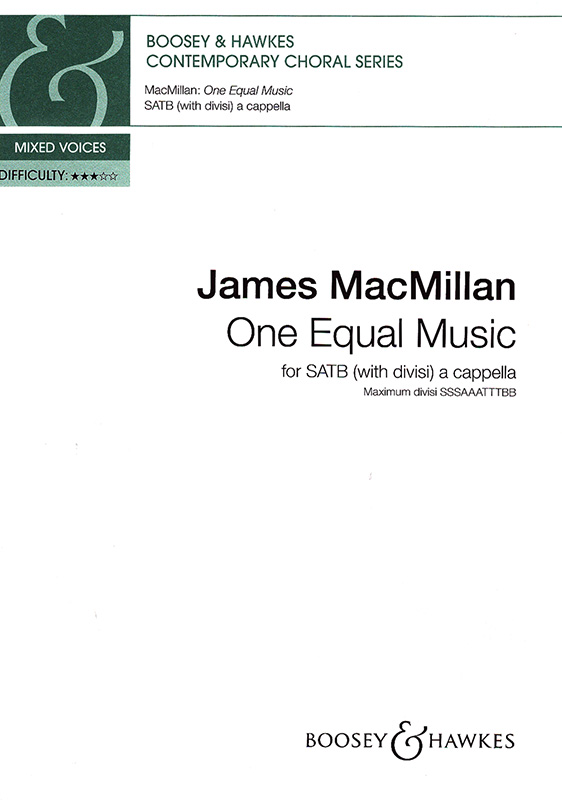 Der schottische Komponist James MacMillan hat zwei schöne, gut zugängliche Chorstücke herausgebracht. „One Equal Music“, geschrieben für gemischten Chor a cappella, teilt sich auf bis zu SSSAAATTTTBB. Zu Probenzwecken ist zudem eine Klavierbegleitung notiert. Die Textgrundlage stammt von John Donne (1572-1631). Das Stück hat eine Dauer von etwa fünf Minuten. Die Premiere war am 21.05.2017 im Selwyn College Cambridge choral evensong, Cambridge mit dem Choir of Selwyn College, Cambridge.