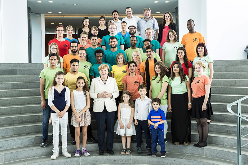 Fotos: Mitglieder von Singasylum Dresden (Chor), Singasylum Dresden mit der Bundeskanzlerin Dr. Angela Merkel am 31.05.2016 (Jesco Denzel)