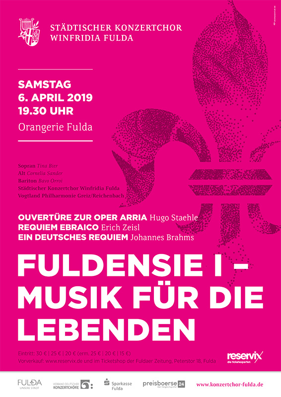 Das erste Konzert am 6. April 2019 in der Orangerie Fulda stand unter dem Motto „Fuldensie I – Musik für die Lebenden“. Unter der Leitung von Chordirektor Carsten Rupp (BDC) präsentierte der Chor gemeinsam mit Solisten und der Vogtland Philharmonie Greiz/Reichenbach das „Deutsche Requiem“ von Johannes Brahms (1833-1897), die weniger bekannte Ouvertüre zu der Oper „Arria“ des in Fulda geborenen Hugo Staehle (1826-1848) und das „Requiem Ebraico“ des jüdischen Komponisten Erich Zeisl (1905-1959).