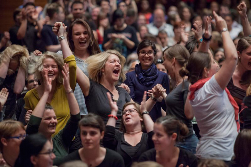 Barbara Lucke: Die Stimmung ist auf dem Höhepunkt, die Location scheint aus allen Nähten zu platzen, ein Vorsänger gibt „We will rock you“ vor und Hunderte fallen begeistert und volltönend ein, La Ola durchläuft die ganze Menge. Wir befinden uns nicht in einem Fußballstadion in Recife (Brasilien), sondern im großen Saal der Weimar-Halle: dort soll in wenigen Minuten die Bekanntgabe der Ergebnisse des 9. Deutschen Chorwettbewerbs (DCW) erfolgen. Das Wetter hatte das Stattfinden unter freiem Himmel unmöglich gemacht, und als dann doch eine Seitenwand herausgenommen wird und alle Platz finden, kann Prof. Jürgen Budday die Resultate verkünden.