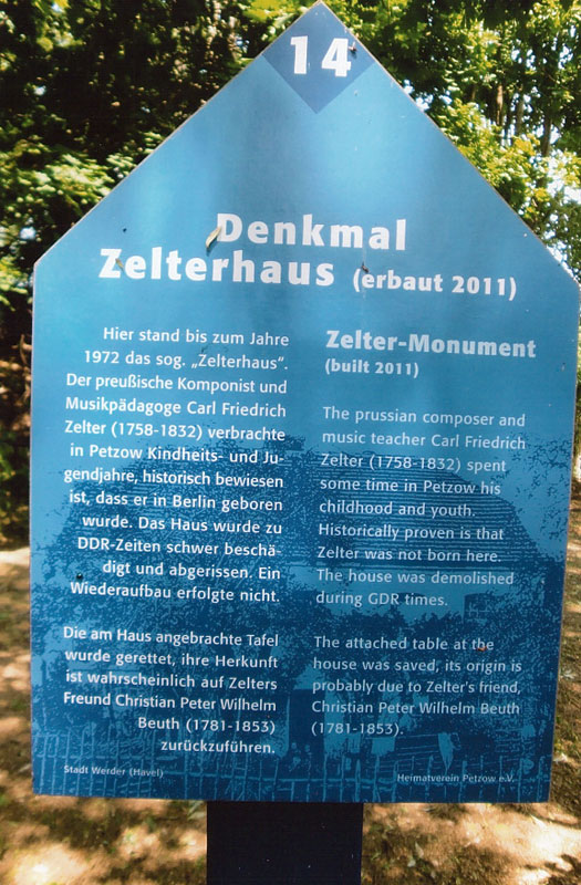 Die Einweihung des Denkmals in Petzowwar sehr gelungen und für uns sehr berührend. Zwar behauptet wohl niemand mehr, Zelter sei dort geboren, wohl aber, dass er ein „Kind" des Ortes war. Die Eltern betrieben eine Ziegelei in Glindow und er verbrachte viele Kindheitstage in Petzow, Das Wohnhaus der Familie ist nicht mehr erhalten – es diente als Depot für Pflanzenschutzmittel – und musste 1973 abgerissen werden.