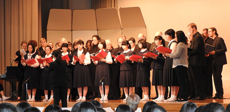 Die nächste Station der Reise war Okayama, eine Metropole im Südosten Japans. Hier kam es in dem neuen, von den internationalen Star-Architekten Kazuyo Sejima und Ryue Nishizawa konzipierten Konzertsaal zu einer eindrücklichen Kulturbegegnung mit dem „Okayama Bach-Kantaten-Verein“; ein Chor, der bereits unter Leitung von deutschen Dirigenten wie Peter Schreier und Helmut Rilling gearbeitet hat. Diesmal gestaltete dieser von seiner Dirigentin gut vorbereitete Chor unter der Leitung von U. Stötzel die Bach-Kantate „Nun komm der Heiden Heiland“ BWV 61. Am Tag vor der Aufführung war Gelegenheit, dieses vielseitige Opus in einer Probe auszuarbeiten, wobei die Solisten aus dem Chor gestellt wurden. Mit großer Aufmerksamkeit wurden von allen Beteiligten die interpretatorischen Impulse Ulrich Stötzels gekonnt umgesetzt. Wenn die Verständigung in Englisch schwierig wurde, übersetzte der mitgereiste Konzertmeister Sohei Takahata ins Japanische. Erfreulicherweise besaßen etliche SängerInnen – insbesondere die Solisten – gute deutsche Sprachkenntnisse. Nachdem das Siegener Collegium vocale mit seiner Interpretation der oben genannten Werke größte Anerkennung fand, gestalteten beide Chöre gemeinsam mit Bachs bekanntem „Wohl mir, dass ich Jesum habe“ einen sehr bewegenden Abschluss! Die anschließenden Gespräche zeigten einmal mehr, wie groß das Interesse in Japan an „deutscher Interpretation“ von europäischer Barockmusik – insbesondere der Musik Johann Sebastian Bachs – ist.