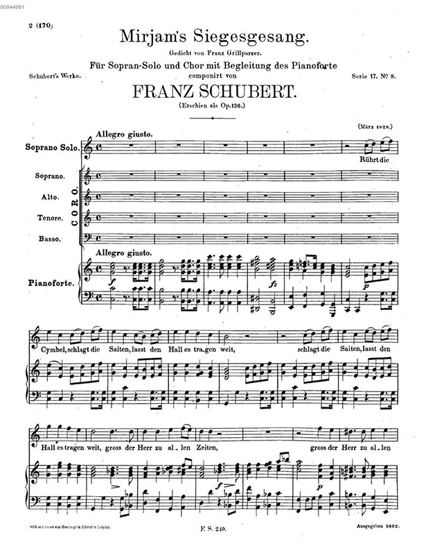 Franz Schubert Kantate Mirjams Siegesgesang op. 136 auf einen Text von Franz Grillparzer (1791-1872) entstand im März seines Todesjahres 1828 und ist geschrieben für Sopran, Chor (SATB) und Klavier. Etwa 18 Minuten benötigt man für die 486 Takte, sie sind durchkomponiert und lassen sich in sechs Abschnitte gliedern. Grundlage des Textes ist der Bericht im 2. Buch Moses (Kap. 15) von der Errettung des Volkes Israel vor der Verfolgung durch die Ägypter. Die Komposition, ein kleines Oratorium, erlebte die Uraufführung posthum, im Rahmen eines Gedächtniskonzertes im Januar 1829. Zeitgenossen empfanden eine Verbindung von „kräftigem Ernst eines Händel mit Beethovens Feuergeist“.