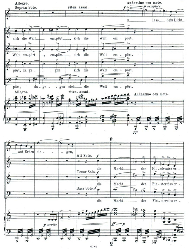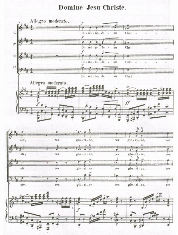 Domine Jesu Christe: (D-Dur, C-Dur, h-Moll, 4/4, 3/4, Allegro moderato, Andantino, Allegro agitato, Abb. 4); Diesem Hauptsatz muss man wegen des inhaltlichen Tiefgangs überragende Bedeutung zuschreiben! Er ist eine chorsymphonische Choralbearbeitung; das Kirchenlied “Jesu, meine Zuversicht“ wird einmal nach der markant-homophonen Einleitung über den polyphon fließenden Chorstimmen instrumental durchgeführt und ein zweites Mal über der brillanten Quam olim Abrahae-Fuge; Hostias et preces in homophoner Satzweise mit Soloquartett und Chor im Wechsel; Wiederholung der Fuge über Orgelpunkt mit dramatischer Steigerung vor dem letzten Choral-Zitat. (Zum besseren Verständnis siehe die o.g. Einführung von Udo-R. Follert).