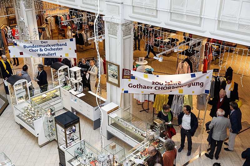 In Gotha fielen die Tage der Chor- und Orchestermusik mit einem besonderen Jubiläum zusammen. Im Jahr 1819 war hier der erste gemischte Chor gegründet und damit der Grundstein für die reiche Chor- und Musikszene in der Stadt heute gelegt worden. Der Bundesmusikverband Chor & Orchester e.V. – der gerade erst am Tag zuvor in Gotha durch Zusammenschluss des Chor- und des Orchesterverbandes entstandene Dachverband der Amateurmusik in Deutschland – überraschte die Stadt am Samstagvormittag mit einem Flashmob im Kaufhaus Moses. Als Geburtstagsständchen trugen die Gratulanten unter anderem das ebenfalls vor etwa 200 Jahren komponierte Volkslied „Die Gedanken sind frei“ vor.