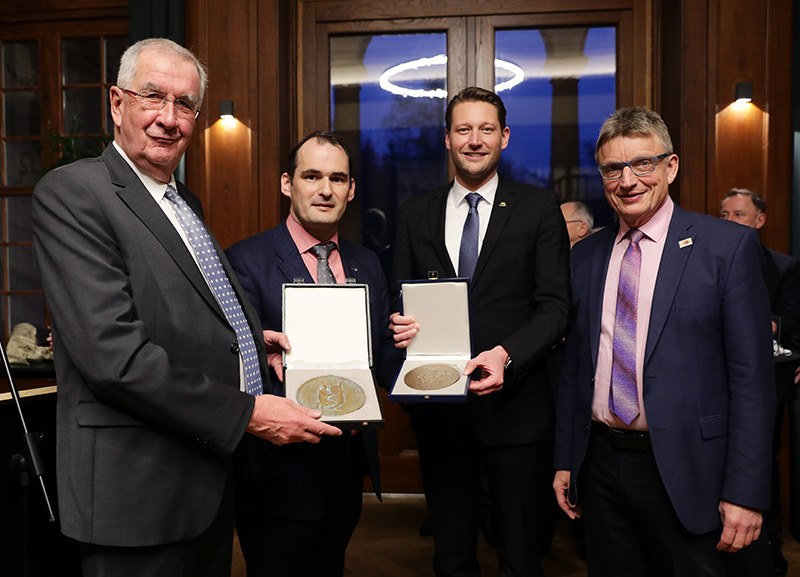 Foto: Mit je einem Muster der Zelter-Plakette und der Pro Musica-Plakette geht die Vorfreude auf die Tage der Chor- und Orchestermusik 2019 von Hessen nach Thüringen über. V.l.n.r.: Ernst Burgbacher, Präsident der Bundesvereinigung Deutscher Orchesterverbände, Christoph Gösel, Geschäftsführer der KulTourstadt Gotha GmbH, Alexander W. Hetjes, Oberbürgermeister von Bad Homburg, und Matthias Balzer, Vizepräsident der Bundesvereinigung Deutscher Chorverbände (Foto: Heiko Rhode)