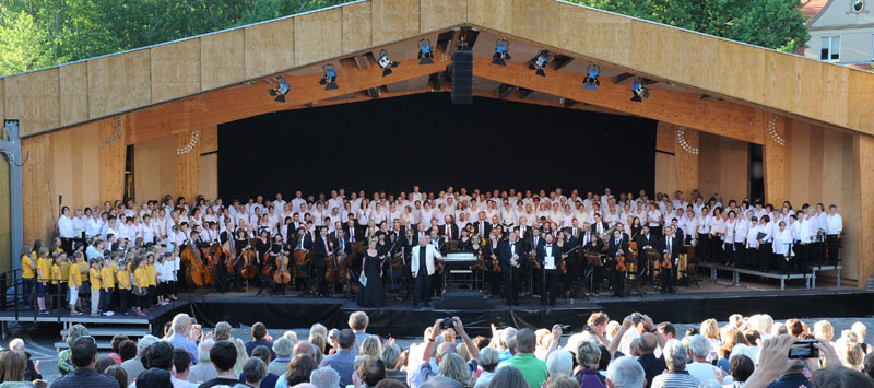 „Allein der Anblick dieser Sängerschar auf der Freilichtbühne imponierte, von der präzis geführten Klangmacht ganz zu schweigen. Christian Möbius beherrscht die Koordination großräumig aufgestellter Sänger und Musiker perfekt. Kein Nachhallen, kein unpräziser Einsatz bei so vielen Sängern, keine Intonationstrübungen, eine ausgefeilte, kontrastreiche Dynamik, eine Vielfalt der Farben und Gefühlslagen: die reine Freude. Seine Tempi waren straff, jedoch nicht überhetzt, sodass ein schwingendes, in der Grundstimmung heiteres Zeitmaß sich einpendelte.