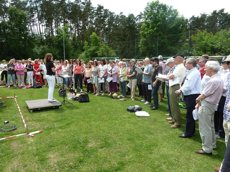 Bei 30° im Schatten proben wir am Samstagmittag im Juni auf dem Fußballplatz des FC Großdechsendorf erstmalig auch die Auf- und Abgänge auf die gedachte Bühne und andere Szenen. Wir singen die Oper einmal durch. Noch immer haben wir erhebliche Textlücken und der Tenor ist zu schwach. „Wir singen auch auf der anderen Seite des Sees nur draußen, Sie müssen Ihr Bestes geben!" bittet uns Frau Biagioni. Wir singen noch einmal. „Schon besser, aber jetzt piano." Wir singen piano. „Aber piano heißt nicht, dass Sie einsinken sollen beim Singen. Auch hier höchste Aufmerksamkeit!" Wir singen wieder. Jetzt klingt es besser. Und auf einmal gibt es den Moment, in dem wir in der Musik drin sind, alle gemeinsam. Wir sind nicht mehr Arzthelferin, Projektleiter oder Grundschullehrerin. Wir sind ein Klangkörper. Wir sind Verdi und seine Kunst.