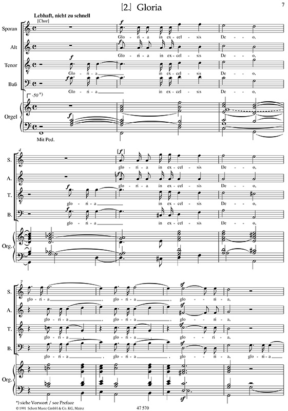 Es hat sich sehr bewährt die Satzvorschrift „Lebhaft, doch nicht zu schnell“ genau zu beachten, da sonst die Sechzehntel zu hastig geraten, so z.B. in Takt 2 in den Frauenstimmen. In Takt 7 – 8 empfiehlt es sich, den Sopran und Tenor decrescendo und den Alt und Bass crescendo singen zu lassen. In Takt 50ff ist molto cantabile zu singen und „terra” mittels eines „messa di voca” zu beleben. In Takt 53 etc. ist „pax hominibus bona voluntatis” im dichten legato zu singen, gleichwohl ist „hominibus” neu anzulauten. In Takt 75 – 78 ist ein „un poco leggiero“ sehr zuträglich. Die Takte 87ff bzw. Takt 93ff sind nicht zu kleingliedrig anzulegen und das Komma nach „gratias“ zu überspannen. Wie so oft ist es sinnvoll, alle Schlusskonsonanten ‚vor der Zeit’ abzusprechen (hier z.B. ab Takt 110), um den Pausen ihren Wert und ihre Wirkung zu belassen und eine koordinierte Absprache aller Stimmen zu erreichen. Ein besonderer Effekt kann erreicht werden, wenn in Takt 147,4 ein „subito piano” nach dem crescendo erfolgt und ab Takt 195 die Lautstärke genau disponiert wird: hier ist ein „mezzo-fortissimo“ und erst in Takt 197 ein fortissimo (mit viel Altklang) sinnvoll; ähnliche Überlegungen sind für Takt 207ff und Takt 219ff nötig.