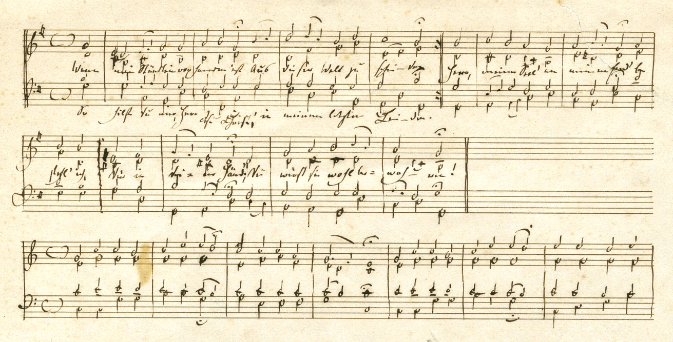 Der erste Choral ist vollständig notiert und mit dem Text „Wenn mein Stündlein vorhanden ist“ versehen. Die von Schumann harmonisierte Melodie ist erstmals 1569 in Frankfurt/M. belegt, der Text stammt von Nikolaus Hermann (1500-1561).