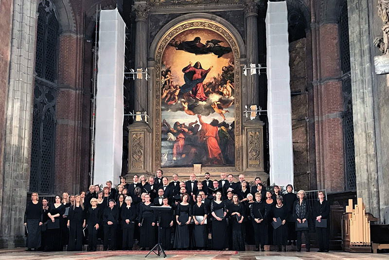 Vor 500 Jahren erschuf der venezianische Meister Tizian sein berühmtes Altarbild Mariä Himmelfahrt, das seither über dem Altar der Basilika Santa Maria Gloriosa dei Frari in Venedig seinen Platz hat. Zu Füßen dieses Kunstwerks der italienischen Hochrenaissance zu singen, bildete den eindrucksvollen Höhepunkt der einwöchigen Chorreise des KölnChors vom 13. bis 20. Oktober 2018. Venezianer und Touristen folgten im vollbesetzten Chorraum der Basilika der Interpretation deutscher Chormusik. Der KölnChor, einer der größten Konzertchöre der Region Köln-Bonn unter der Leitung von Wolfgang Siegenbrink, zog die Zuhörer mit Motetten und Chorälen von Anton Bruckner, Johann Sebastian Bach, Ludwig van Beethoven, Felix Mendelssohn-Bartholdy, Rudolf Mauersberger, Richard Wagner und Wolfgang Amadeus Mozart in seinen Bann. Als Solistin überzeugte die Sopranistin Angela Götzensperger mit geistlichen Liedern von Antonín Dvořák, begleitet wurde sie an der Orgel von Christoph Hamm.