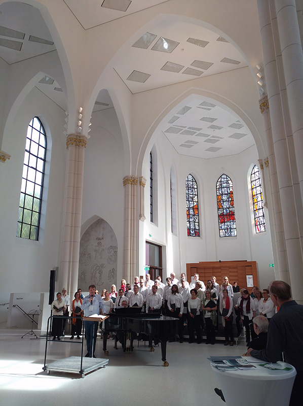 Mit Assoziationen zu den Begriffen „Singen“ und „frei“, die in einem Wortspiel das Motto für das Landeschorfest NRW 2018 in Bochum bilden, eröffnete Christian Komorowski, der Vorsitzende des VDKC-Landesverbandes NRW, pünktlich 13 Uhr die Veranstaltung. In der beeindruckenden Atmosphäre des Anneliese Brost Musikforums versammelten sich zahlreiche interessierte Gäste. Das Gebäudeensemble verbindet das Konzerthaus für die Bochumer Symphoniker mit einem Saal für die städtische Musikschule sowie einem großzügigen Konzertfoyer einer früheren Kirche und ist längst zu einem musikalisch-künstlerischen Zentrum der Region geworden.