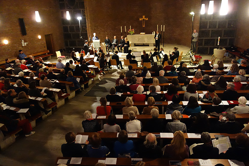 Eine freudig-erregte Grundstimmung liegt in der Luft an diesem Samstag Januar-Abend in der modernen Christuskirche in Darmstadt-Eberstadt. Gedränge herrscht am Einlass, die Plätze sind streng nach Stimmfach eingeteilt. Soprane links, Bässe rechts, in der Mitte Alt und Tenor. Klavierauszüge kommen zum Vorschein, Sitznachbarn werden begrüßt. Einige der Angekommenen halten noch Ausschau nach geeigneten Plätzen. Es geht schließlich darum, und so verspricht es auch die Ankündigung im Flyer, die kommenden rund 150 Minuten optimal am musikalischen Geschehen teilhaben zu können. Man will ganz mittendrin sein. Viele haben ihren Platz schon gefunden und tauschen sich eifrig mit Gleichgesinnten aus. Auf den Bankreihen der Sopran- und Altstimmen ist die Auswahl schon stark eingeschränkt. Anders bei den Männerstimmen, wo noch reichlich Auswahl zur Verfügung steht. Dies hier ist nicht einfach eine Chorprobe. Wer Einlass begehrt, muss ein Ticket vorweisen sowie die richtigen Noten. Zum ‚Singalong’ hat Wolfgang Seeliger gerufen, und viele sind gekommen. Allen ist eines gemeinsam: Sie haben den Klavierauszug von Georg Friedrich Händels großartigem Oratorium „Messiah“ mitgebracht, um daraus gemeinsam zu singen.