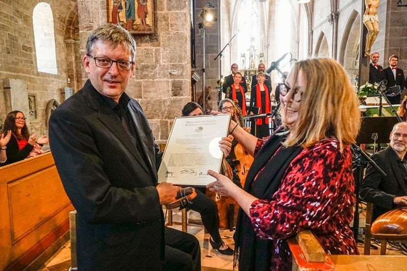Zum Auftakt des Konzertes gab es im Münster Heilsbronn eine festliche Preisverleihung: Der Dirigent Hans-Christoph Rademann nahm den Jahrespreis 2016 der deutschen Schallplattenkritik (PdSK e.V.) mit seinem Elite-Ensemble, dem Dresdner Kammerchor, entgegen, mit dem er die große Heinrich-Schütz-Edition in Angriff genommen hatte.