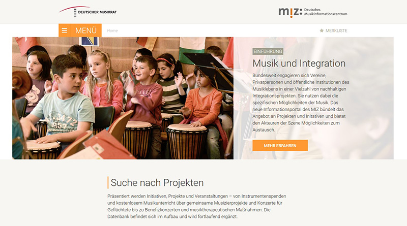 Eine zentrale Plattform für die Akteure musikalischer Integrationsangebote stellt ab sofort das Deutsche Musikinformationszentrum (MIZ), eine Einrichtung des Deutschen Musikrats, zur Verfügung. Unter integration.miz.org können Veranstalter und Anbieter im Bereich Flüchtlingshilfe und Migrationsarbeit ihre Aktivitäten bundesweit präsentieren. Das Angebot befindet sich im Aufbau und wird fortlaufend um neue Projekte und Inititativen erweitert. Akteure der musikalischen Integrationsarbeit sind eingeladen und aufgerufen, sich an dem Angebot zu beteiligen.