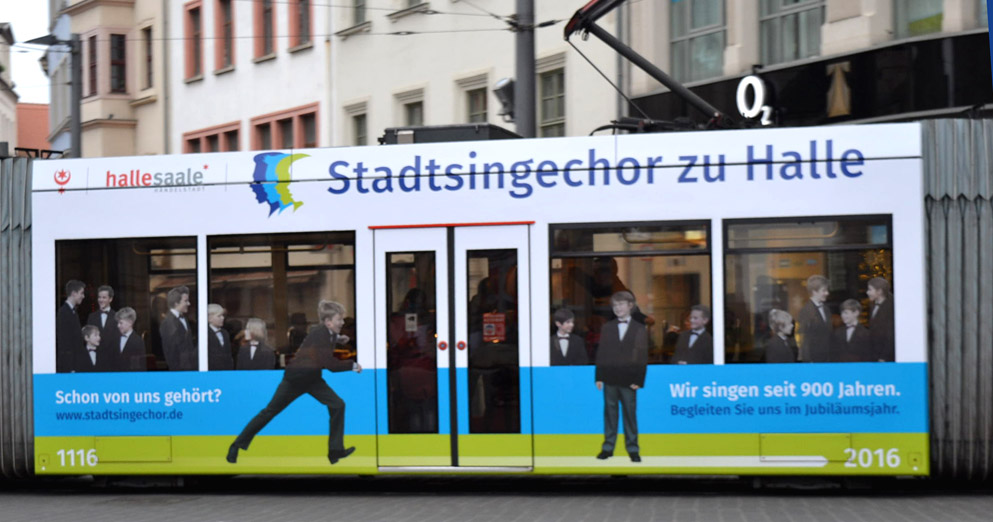 Seit Anfang Dezember 2015 fahren eine Straßenbahn und ein Bus auf den Stadtlinien des Öffentlichen Personennahverkehrs durch die Stadt Halle und weisen hin auf eine traditionsreiche Institution der Stadt und ihr überaus bedeutendes Jubiläum: Der Stadtsingechor zu Halle feiert mit einem Festkonzert am 8.5.2016 sein 900-jähriges Bestehen.