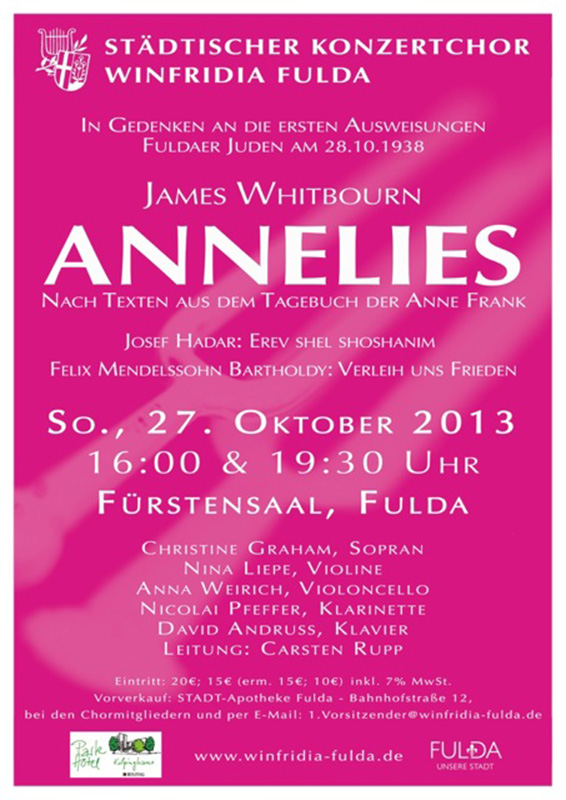 Im Gedenken an die erste Ausweisung Fuldaer Juden (28.10.1983) erklingen am 27.10.2013 im Stadtschloss Fulda Josef Hadars: Erev shel shoshanim, James Whitbourns: Annelies – The Anne Frank Oratorium (Chamber Version) und Verleih uns Frieden von Felix Mendelssohn-Bartholdy.