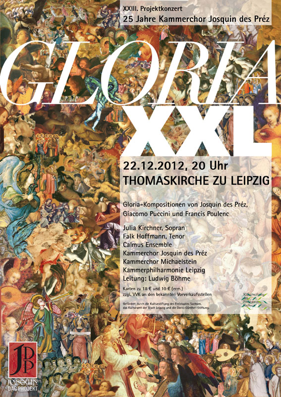 Mit einem festlichen Konzert begeht der Kammerchor Josquin des Préz sein 25-jähriges Bestehen. Passend zu den Lebensstationen des Namensgebers Josquin erklingt großartige französische und italienische Musik – dem Anlass entsprechend allerdings in XXL: Poulencs „Gloria" sowie Puccinis „Messa di Gloria" stehen auf dem Festprogramm am Sa, 22. Dezember 2012, um 20 Uhr in der Thomaskirche Leipzig.