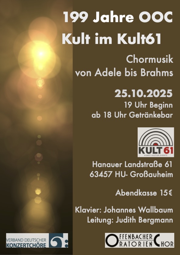 In der neuen Kulturhalle Kult61 in Hanau-Großauheim präsentiert der Offenbacher Oratorienchor im Oktober ein abwechslungsreiches Konzert. Die stilistische Bandbreite reicht vom eindringlichen „Dies Irae“ über das swingende "Lullaby of Birdland" bis zum dramatischen „Skyfall“. Freuen Sie sich auf ein besonderes Klangerlebnis! Die Karten sind an der Abendkasse erhältlich, können aber auch per Mail an