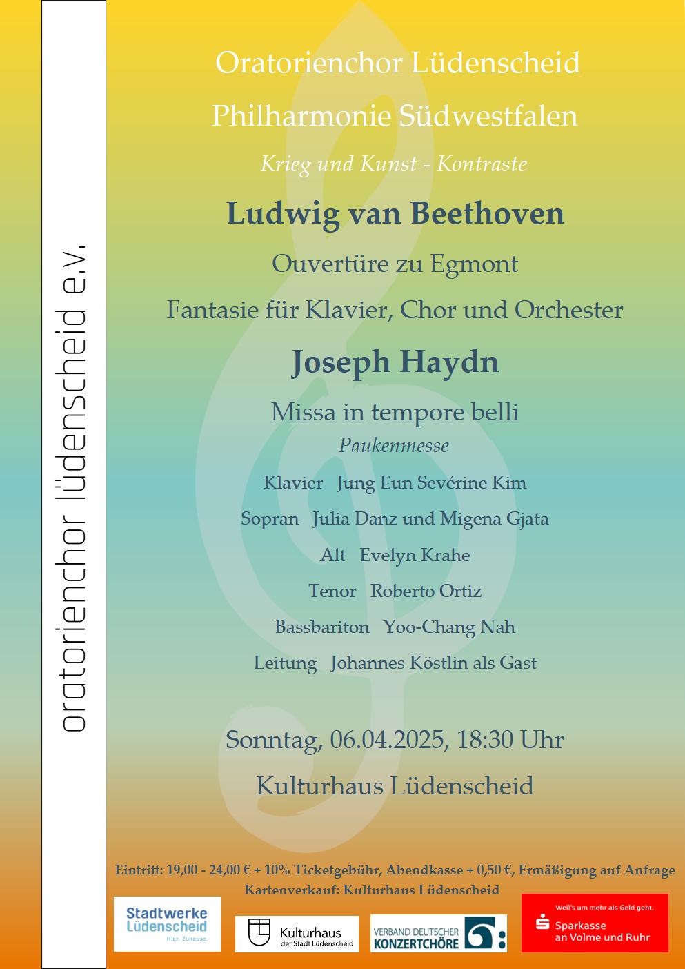 Das Konzert… die Stücke der Aufführung wurden in Zeiten der napoleonischen Kriege komponiert. In ihnen brachten die Komponisten ihre Trauer um die Toten und ihre Sehnsucht nach Frieden zum Ausdruck und schufen Seelen-Zufluchtsorte, die alle Kriege überlebten und bis heute nichts an ihrer Aussage und Wirkung verloren haben. Beethovens Chorphantasie ist eine Hymne an die Zauberkraft der Musik. Die Paukenschläge, angelehnt an die französischen Armeepaukenwirbel, in der „Missa in tempore Belli“ - Messe in Zeiten des Krieges - sind eindringliches Stilmittel Haydns und gaben der Messe ihren späteren Beinamen.