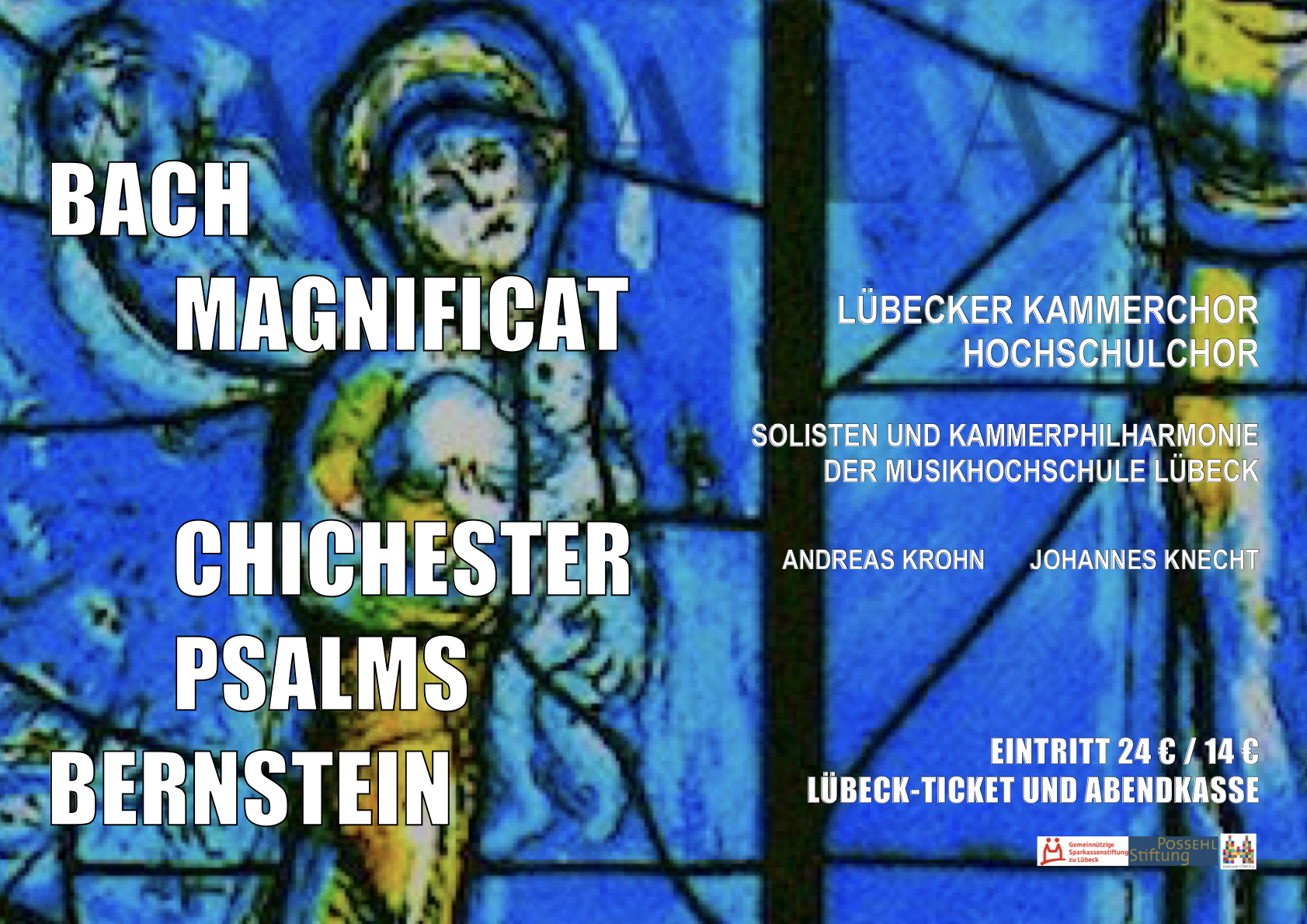 In musikalischer Kooperation mit dem Hochschulchor (Leitung: Prof. Johannes Knecht) und Solo-Sänger*innen sowie Instrumentalist*innen der Musikhochschule Lübeck werden folgende Werke realisiert: Johann Sebastian Bach, Magnificat (BWV 243) und Leonard Bernstein, Chichester Psalms.