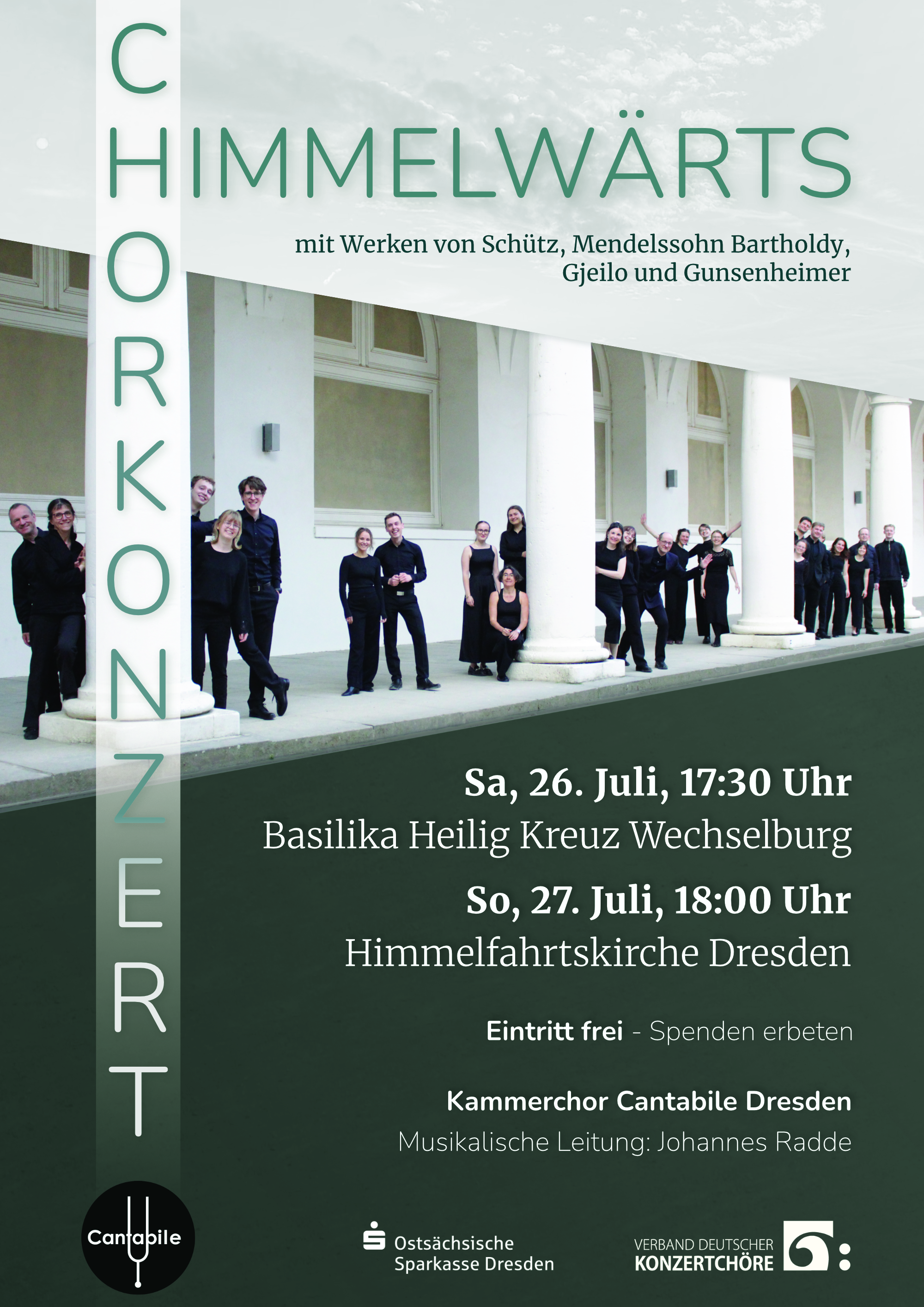 Der Kammerchor Cantabile Dresden lädt zu seinen Konzerten am 26. Juli um 17:30 Uhr in der Basilika Heilig Kreuz Wechselburg und am 27. Juli um 18:00 Uhr in der Himmelfahrtskirche Dresden ein.