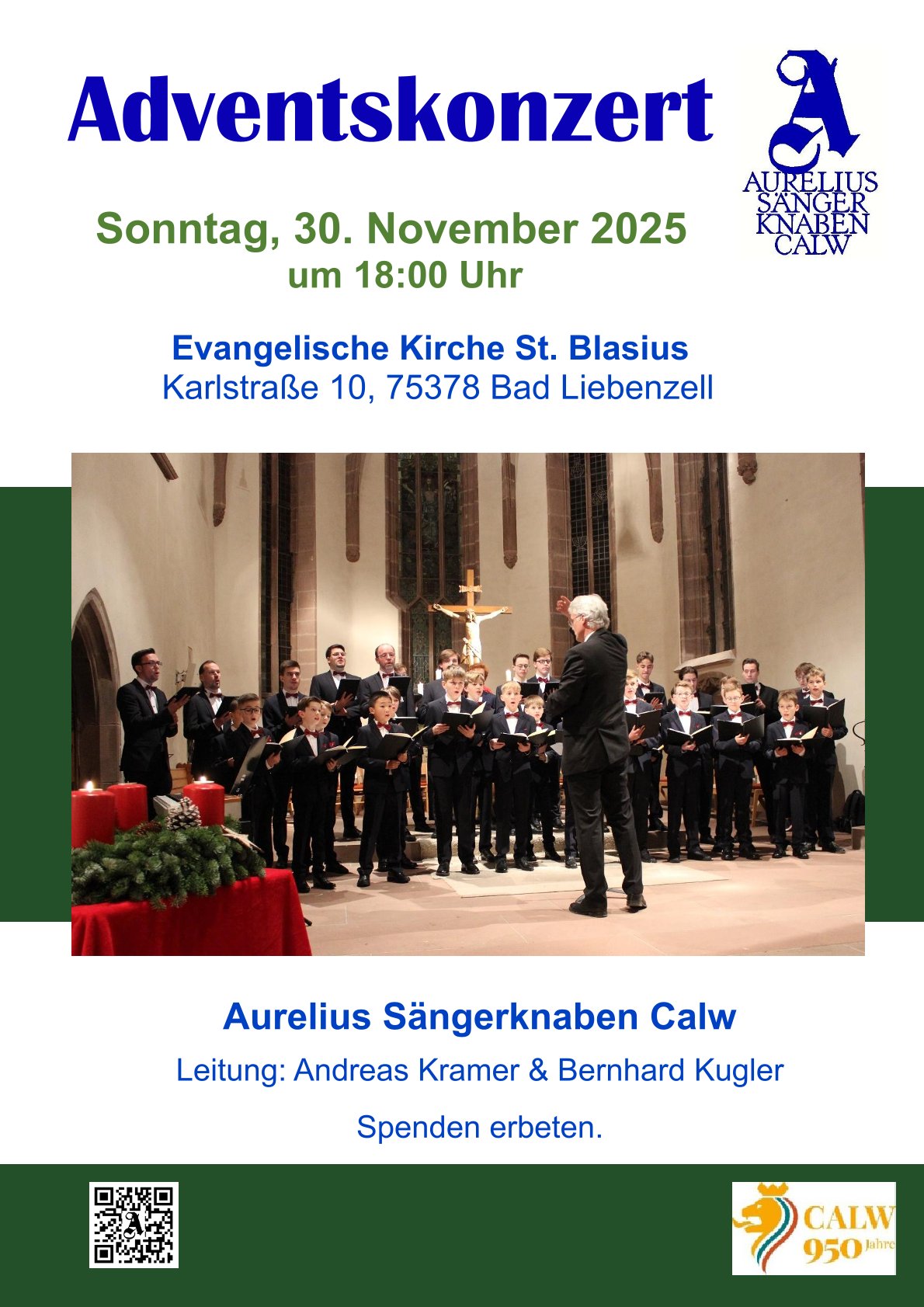Am Sonntag, den 30. November, findet um 18:00 Uhr in der St. Blasius Kirche in Bad Liebenzell ein besinnliches Adventskonzert mit den Aurelius Sängerknaben Calw statt. Die Vielfalt der Werke reicht von festlich-traditionellen Stücken bis hin zu geistlichen Motetten wie „Ach wann kommen jene Stunden“ und „Macht hoch die Tür“ (F. Silcher) passend zur Vorweihnachtszeit. Der Eintritt ist frei, um Spenden wird gebeten.