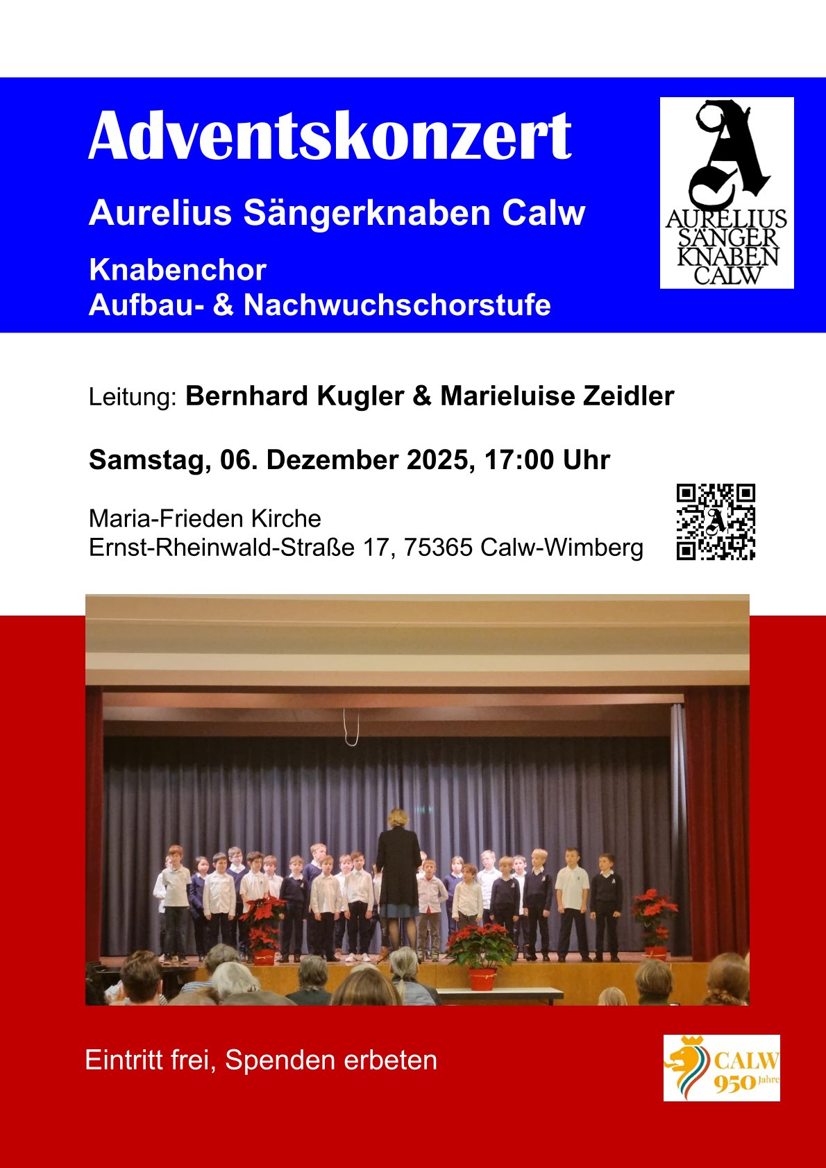Am Sonntag, den 4. Dezember um 16:00 Uhr tritt der Nachwuchs- und Aufbauchor der Aurelius Sängerknaben Calw in der Kirche Maria Frieden/Wimberg auf. Unter der Leitung von Bernhard Kugler wird ein festliches Programm mit besinnlichen Advents- und Weihnachtsliedern vorgetragen.