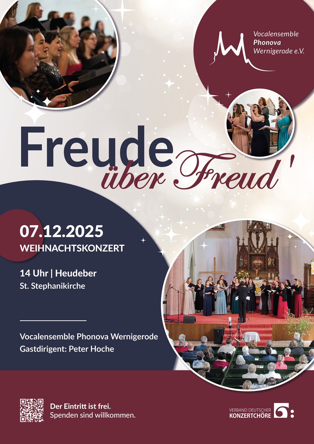 Am Sonntag, 7. Dezember 2025, lädt das Vocalensemble Phonova Wernigerode ab 14 Uhr zu einem Adventskonzert in die evangelische St. Stephanikirche in Heudeber. Auf dem Programm stehen fröhliche und besinnliche Lieder, die die Vorfreude auf das Weihnachtsfest wecken sollen. Weit über die Grenzen Deutschlands blickt der Frauenchor dabei mit weihnachtlichen Kompositionen aus aller Welt auch auf die festlichen Bräuche anderer Nationen. Die Vielfalt des Programms reicht von Klassikern und Neuentdeckungen bis hin zu populären Melodien aus dem Film „Sister Act“. Die künstlerische Leitung übernimmt Gastdirigent Peter Hoche. Der Eintritt ist frei, Spenden sind willkommen.