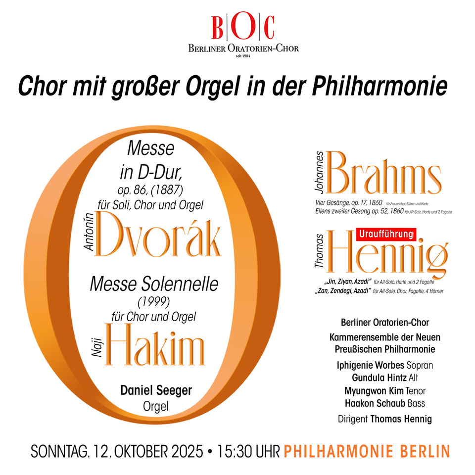 Im nächsten Konzert im Herbst dieses Jahres möchte der Chor seinem Vorhaben treu bleiben, in der Zusammenführung von geistlicher und weltlicher Musik, von neueren und eher bekannten älteren Werken dem Publikum ein vielfältiges Hörerlebnis zu ermöglichen mit – vielleicht überraschenden – wechselseitigen Bezügen. Bei der Aufführung am 12.10.2025 werden also zwei Messen einander gegenübergestellt: die Messe D Dur von Antonín Dvořák aus dem 19. Jahrhundert (1887) und die etwa 100 Jahre später (1999) komponierte Messe Solennelle von Naji Hakim. Beide sind für Chor und Orgel konzipiert. In unserem Konzert-Programm kombinieren wir diese geistlichen Werke mit weltlichen Gesängen aus dem 19. und 21. Jahrhundert. Johannes Brahms vertonte in seinen Gesängen für Frauenchor (1860) Texte aus der „literarischen Romantik“ und Thomas Hennig wählte 2024 eine weltweit verbreitete Parole gegen die Bedrohung der Freiheit von Frauen (einmal in kurdischer und einmal in persischer Sprache) als Grundlage von zwei Stücken für Alt und gemischten Chor. Sie sind Einzeltitel aus der Sammlung „Geminiden 23“.