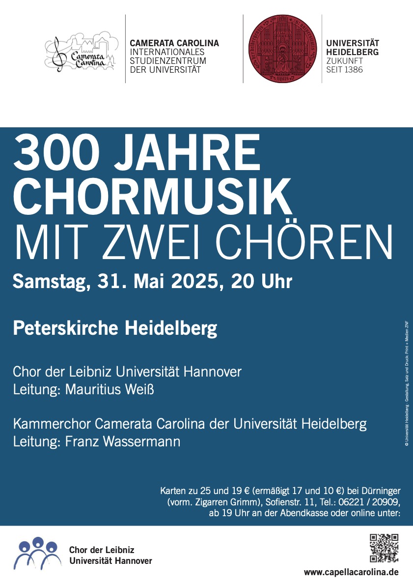 Am 31.05.2025 um 20 Uhr wird die Camerata Carolina gemeinsam mit dem Chor der Leibniz Universität Hannover in der Peterskirche Heidelberg das Programm “Chorwerke aus 300 Jahren” präsentieren. Sie werden berühmte Kompositionen von Bach, Brahms und Bruckner, zum Teil doppelchörig, hören, dazuhin solche von Mendelssohn und Gade.