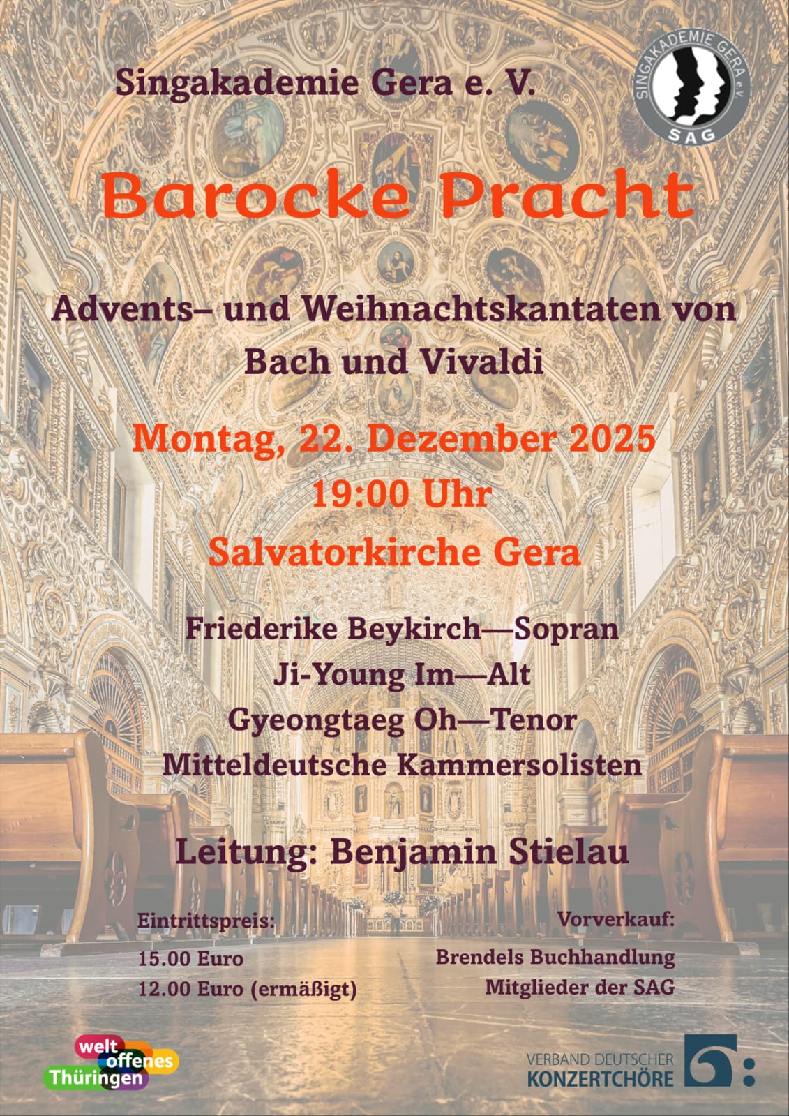 Es erklingen das „Gloria“ für Streicher und Chor in D-Dur von Antonio Vivaldi sowie die Kantate zum ersten Advent „Nun komm der Heiden Heiland“ von Johann Sebastian Bach.