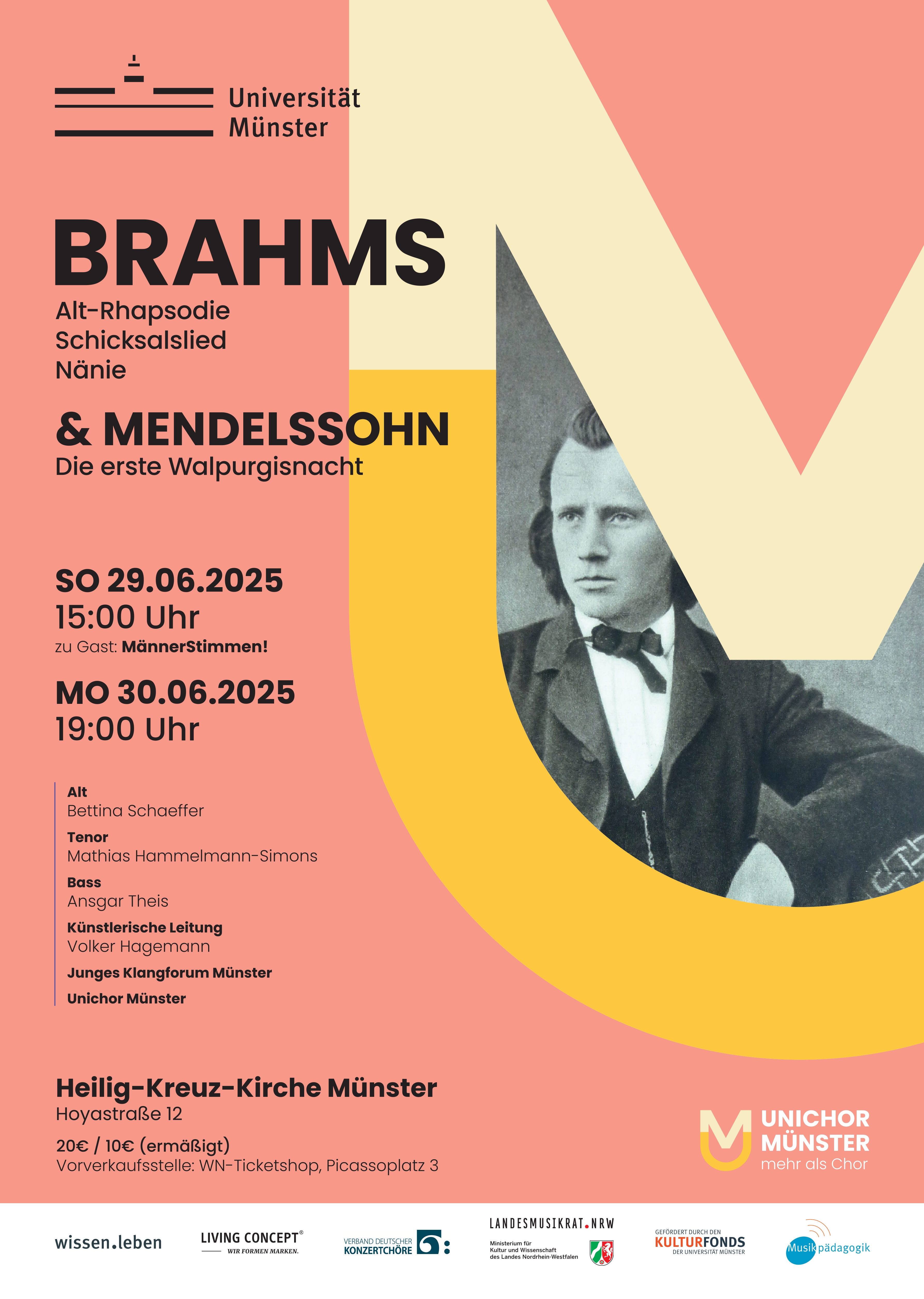 Schicksal, Sehnsucht und dämonischer Spuk: Der Unichor Münster lädt zu zwei eindrucksvollen Konzerten in die Heilig-Kreuz-Kirche Münster ein. Auf dem Programm stehen tief bewegende und dramatisch aufgeladene Werke zweier großer Romantiker: Johannes Brahms und Felix Mendelssohn Bartholdy. Brahms’ „Schicksalslied“ und „Nänie“ spannen den Bogen von metaphysischer Verlorenheit bis hin zu einem feierlichklagenden Lob der Vergänglichkeit. Die „Alt-Rhapsodie“ – interpretiert von der herausragenden Altistin Bettina Schaeffer, dem neu gegründeten UniMännerchor und eingeladenen MännerStimmen! aus ganz Deutschland – wird zum intimen Gebet eines verletzten Herzens. Im Kontrast dazu entfaltet Mendelssohn in seiner weltlichen Kantate „Die erste Walpurgisnacht“ ein musikalisches Schauspiel voller Witz, Spannung und satirischer Schärfe: Heidnische Druiden täuschen ihre christlichen Verfolger mit einem nächtlichen Spektakel – ein packendes Wechselspiel aus Licht und Schatten.