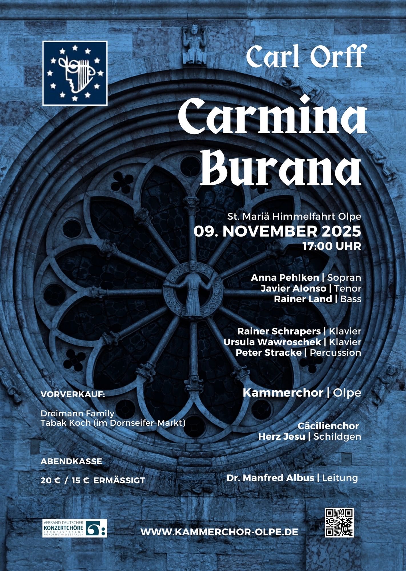 Der Kammerchor Olpe und der Cäcilienchor Schildgen unter Leitung von Dr. Manfred Albus führen die Carmina Burana von Carl Orff in der Fassung seines Schülers Wilhelm Killmayer für Chor, zwei Klaviere und Schlagwerk auf.