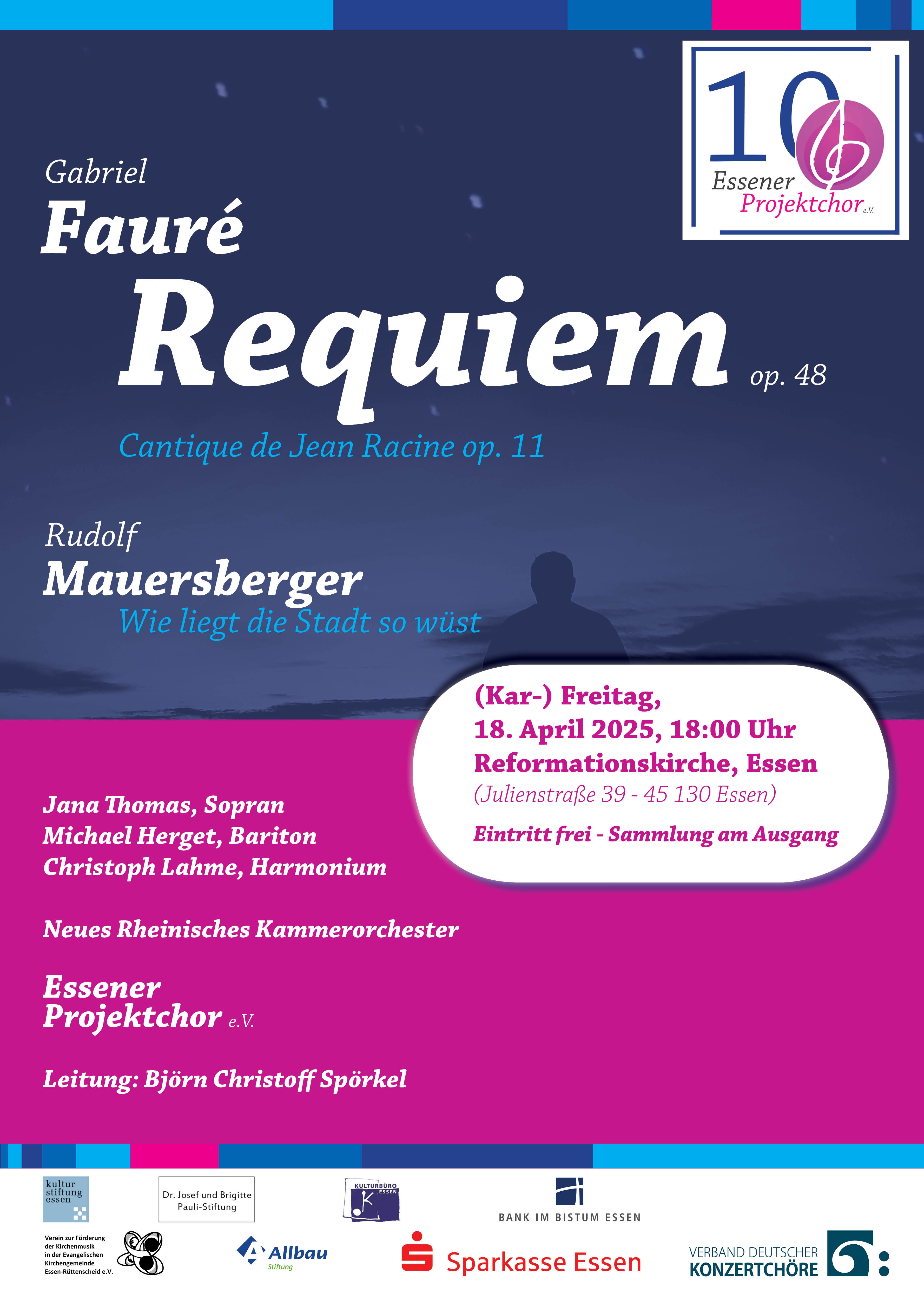 Der Essener Projektchor e. V. lädt wieder zum Passionskonzert in die Reformationskirche Essen-Rüttenscheid ein. Hauptwerk des Konzertes ist das Requiem op. 48 von Gabriel Fauré in einer exquisiten Kammermusikbesetzung. In freundlichen Farben spendet Faurés Werk Trost und Hoffnung im Angesicht von Tod und Ewigkeit. Das preisgekrönte Jugendwerk Faurés „Cantique de Jean Racine“ und die Trauermotette „Wie liegt die Stadt so wüst“ von Rudolf Mauersberger, entstanden unter dem Eindruck der Zerstörung Dresdens, eröffnen den Abend.