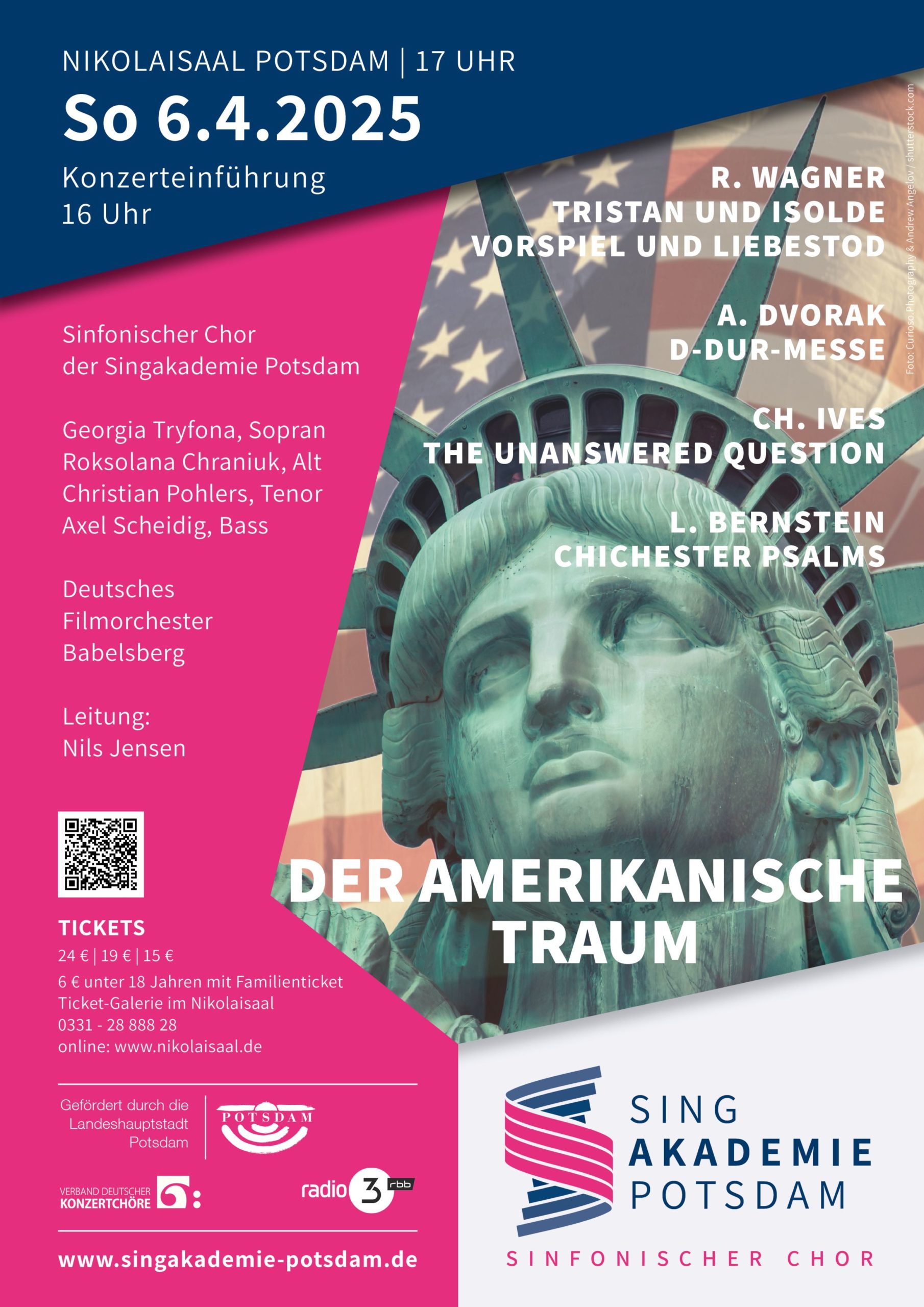 Lassen Sie sich von der Singakademie Potsdam und dem Deutschen Filmorchester Babelsberg unter Leitung von Nils Jensen auf diese musikalische Reise mitnehmen und verfolgen Sie den harmonischen Weg von Wagner bis Bernstein – der amerikanische Traum lebt!