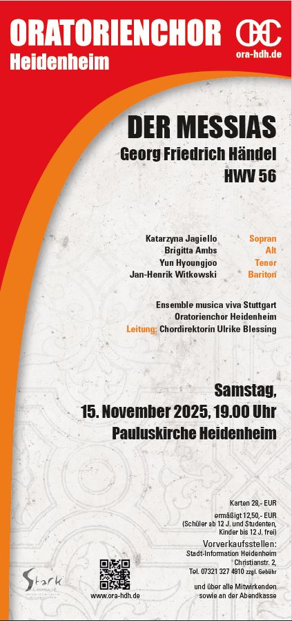 Tickets sind für 28 € [erm. 12,50€] in der Stadt-Information Heidenheim, bei Schreibwaren Süßmuth Giengen oder über die Mitglieder des Oratorienchors erhältlich.
