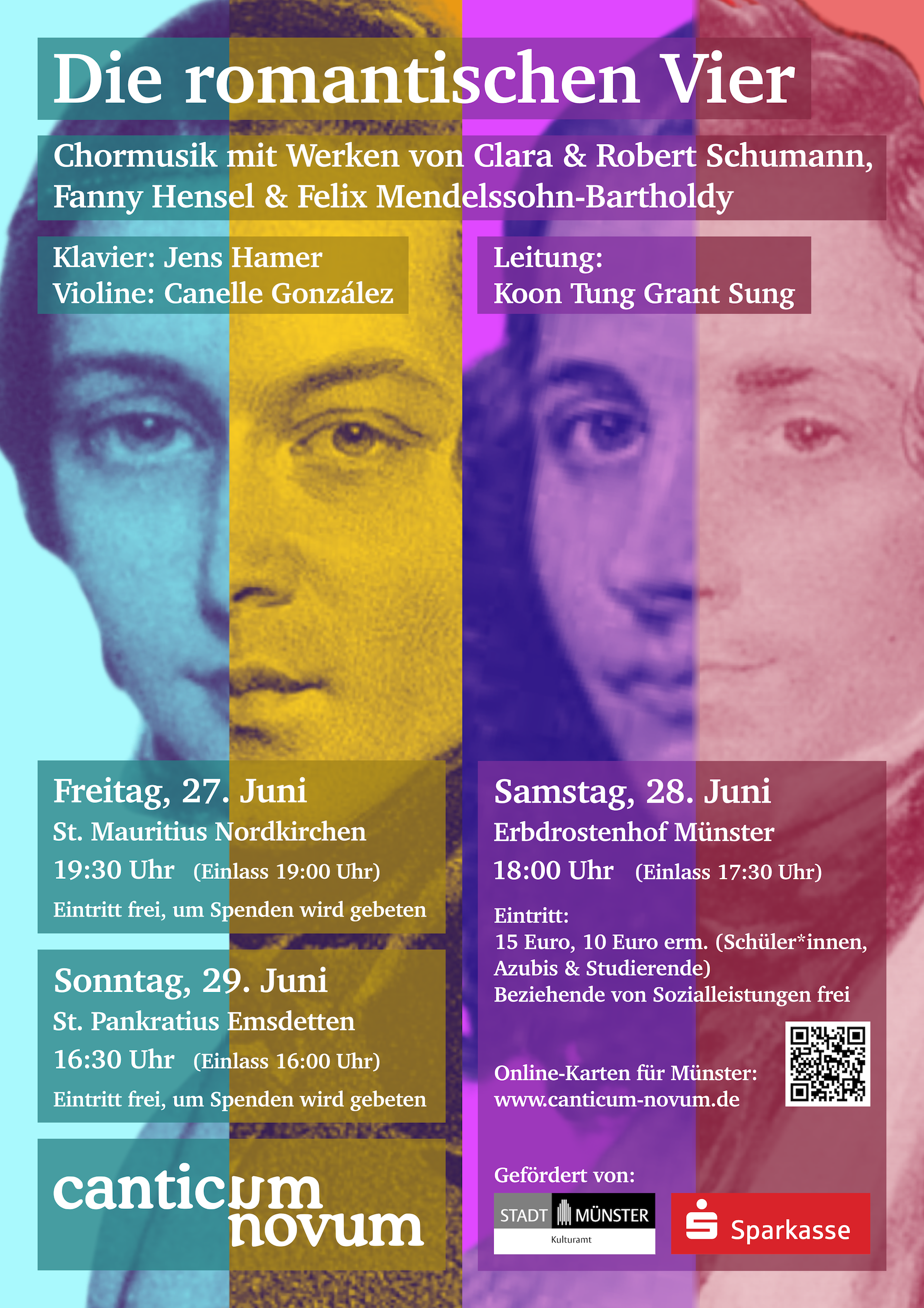„Romantische Musik ist der Grund der deutschen Musik“ – sagt unser Chorleiter Grant Sung. „Viele Menschen verlieben und verlieren sich darin: Schumann, Mendelssohn – klar! Aber was ist mit Clara Schumann und Fanny Hensel?“ Unter dem Titel „Die romantischen Vier“ bieten wir Ihnen einen bunten musikalischen Strauß kleinerer Werke von Fanny Hensel, Felix Mendelssohn Bartholdy sowie Robert und Clara Schumann.