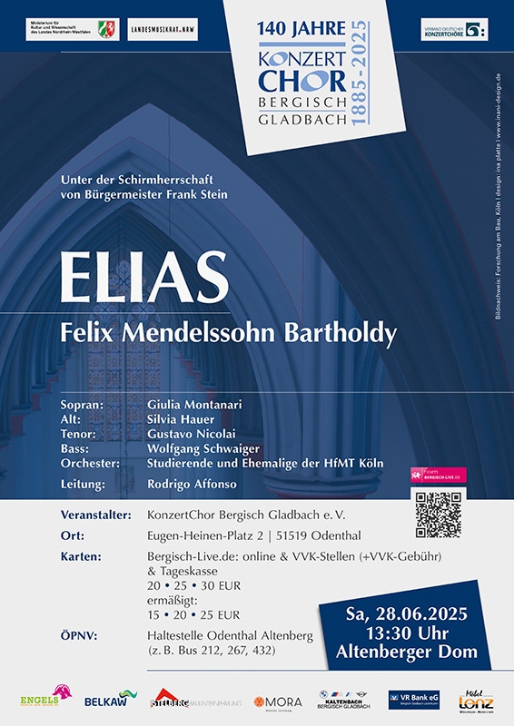Im Jahr seines 140-jährigen Bestehens präsentiert der KonzertChor Bergisch Gladbach am Samstag, 28. Juni, um 13.30 Uhr, den „Elias“ von Felix Mendelssohn Bartholdy im Altenberger Dom.