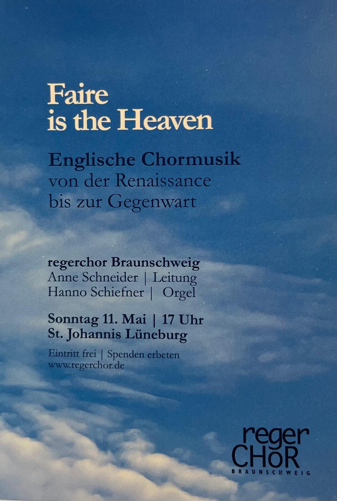 Am 11. Mai 2025 gastiert der regerchor Braunschweig um 17:00 mit Werken englischer Komponisten in St. Johannis in Lüneburg. Das breitgefächerte Programm unter dem Namen „Faire is the Heaven“ umspannt vier Jahrhunderte englischer Chormusik und bietet unter anderem Werke von William Byrd, Robert Parsons, Edward Elgar, Henry Purcell, William Harris und Edward Bairstow. Der Chor wurde 1988 gegründet und ist seit dieser Zeit ein fester Bestandteil des Braunschweiger Musiklebens. Die musikalischen Schwerpunkte des Chors liegen in den Chorwerken der Romantik und der jüngeren Musikgeschichte.