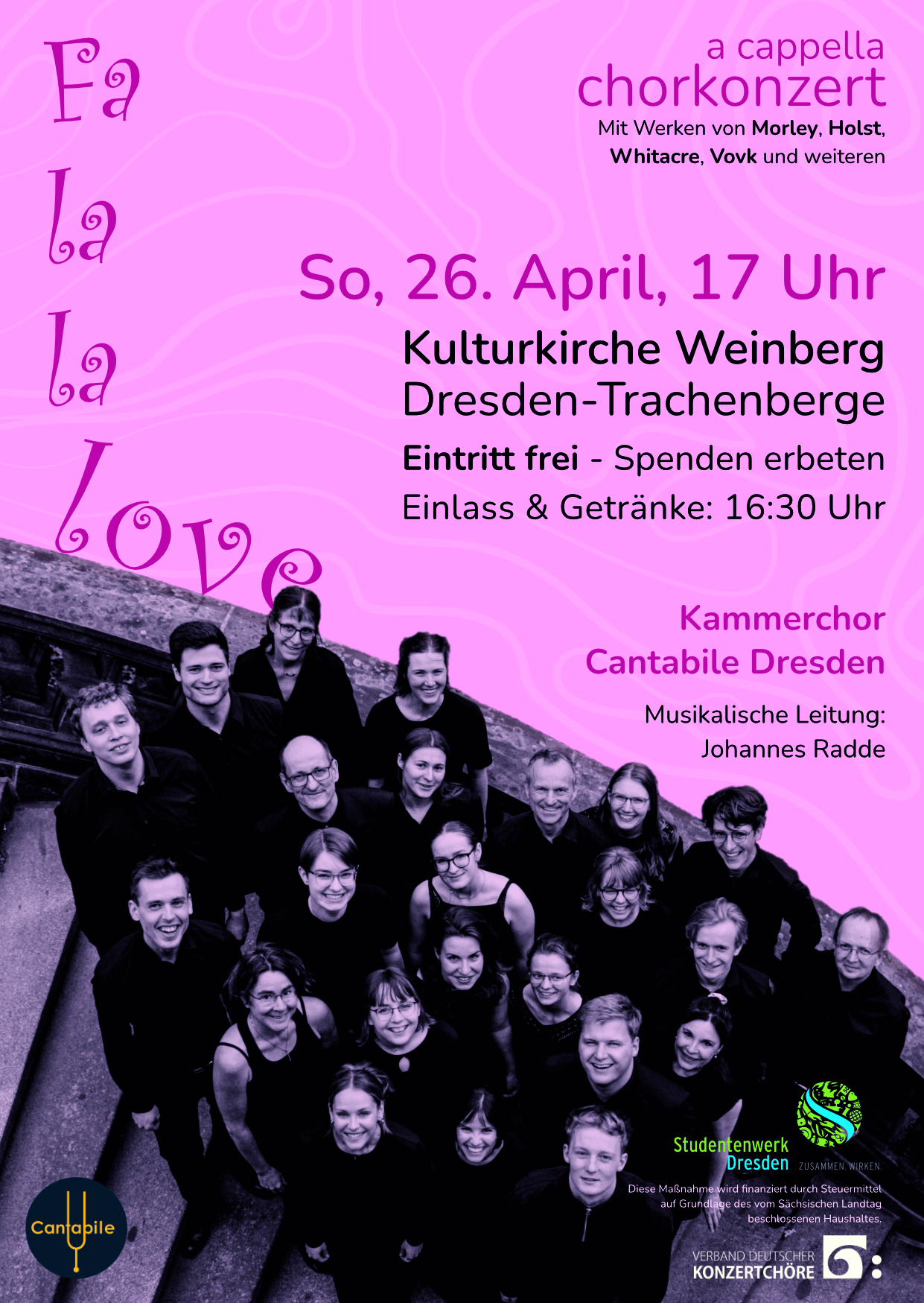 Englische Madrigale, Liebeslieder und Tänze spiegeln verschiedene Facetten der Liebe wider. Freuen Sie sich auf weltliche a cappella Musik von Hassler, Hensel, Whitacre, Vovk und weiteren. Einlass und Getränke ab 16:30 Uhr.