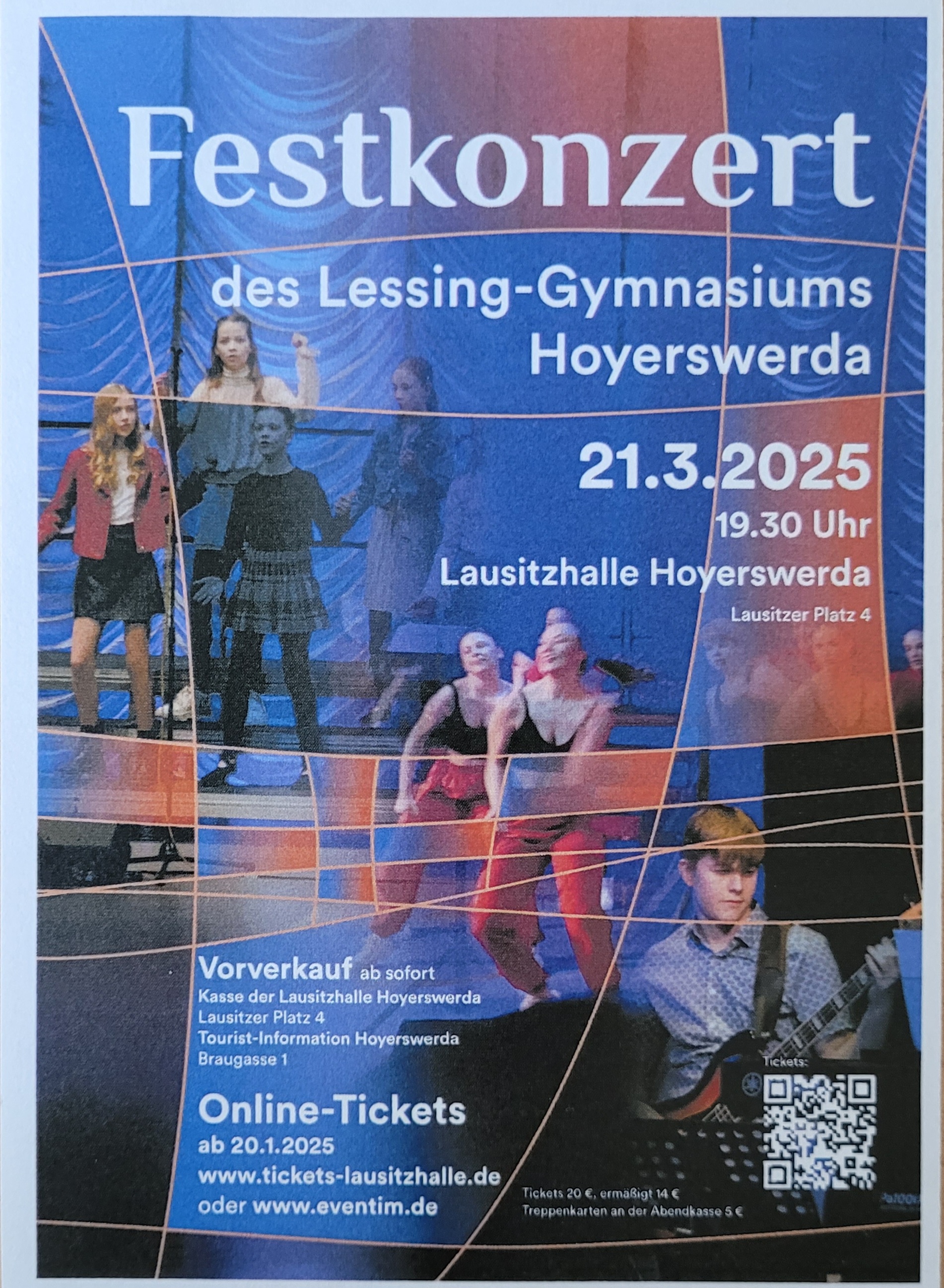 Auch dieses Jahr lädt das Lessing-Gymnasium Hoyerswerda traditionell zum Festkonzert als jährlichen Höhepunkt alle Eltern, Schülerinnen und Schüler, Lehrer und Lehrerinnen, Verwandte, Bekannte, öffentliche Personen der Stadt Hoyerswerda, Interessierte aber auch Ehemalige und Freunde des Gymnasiums ein.