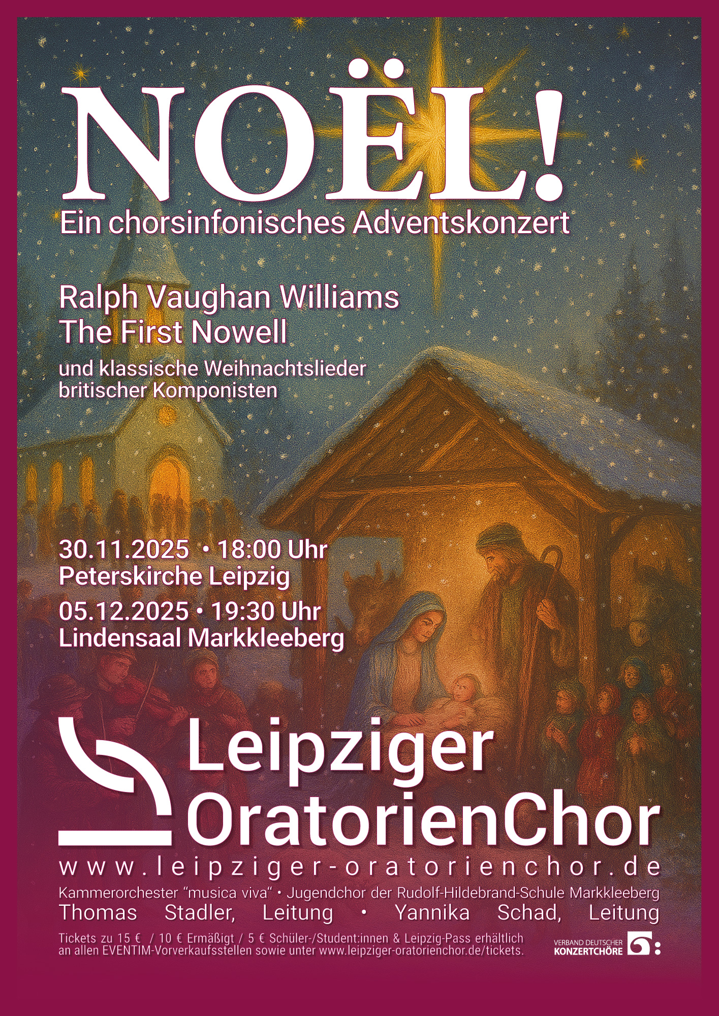 Mit festlichen Klängen lädt unser Adventskonzert „Noël“ dazu ein, englische Weihnachtsmusik in all ihren Facetten zu entdecken. Im Mittelpunkt steht Ralph Vaughan Williams’ berührendes Werk „The First Nowell“. Daneben erklingen bekannte Stücke wie „O holy night“, „Away in a manger“ oder „Carol of the Bells“ – teils festlich mit Orchester, teils in stimmungsvollen A-cappella-Besetzungen. Gestaltet wird das Konzert vom Leipziger OratorienChor, dem Jugendchor der Rudolf-Hildebrand-Schule Markkleeberg und dem Kammerorchester musica viva – drei Ensembles, die gemeinsam die Vorfreude auf Weihnachten zum Klingen bringen.