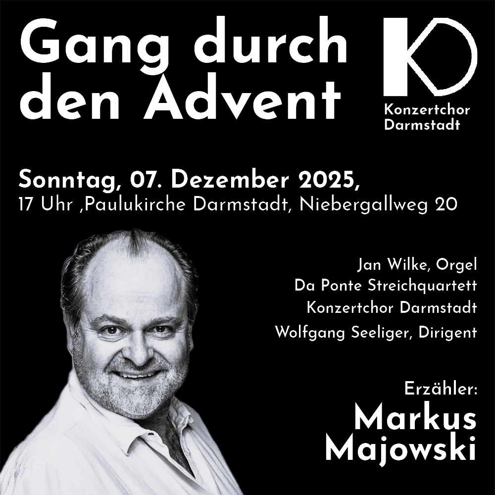Der Konzertchor Darmstadt veranstaltet seinen „Gang durch den Advent“ dieses Jahr am 2. Adventswochenende, So. 7.12.2025, 17 Uhr und singt sowohl a - cappella als auch begleitet von einem Instrumentalensemble und Orgel.