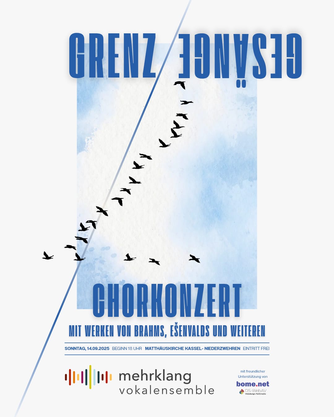 Unter dem Titel "GRENZ/GESÄNGE" präsentieren wir ein schönes und stimmungsvolles Programm mit Werken von Brahms, Ešenvalds, Chilcott, u.a., die sich mit dem vielschichtigen Thema aus verschiedenen Perspektiven auseinandersetzen.