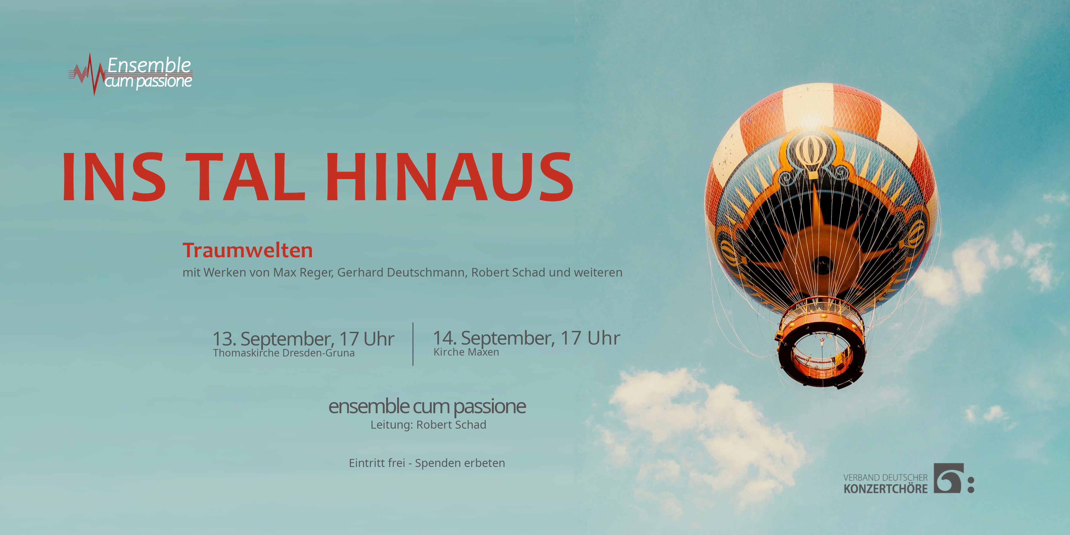 Das Ensemble cum passione erkundet in den diesjährigen Konzerten der „Ins Tal hinaus“ – Reihe die zahlreichen Facetten des Träumens. So erklingen unter anderem geistliche Werke („Unser lieben Frauen Traum“, M. Reger), Vertonungen von Texten aus Shakespeares "Sommernachtstraum" und Kompositionen aus Hollywood und der Filmwelt, die gerne auch ‚Traumfabrik‘ genannt wird.
