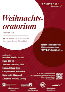 Ein festliches Konzertereignis der besonderen Art erwartet Sie am Sonntag nach Weihnachten: Der Bachverein Düsseldorf bringt unter der Leitung von Alexander Niehues das komplette Weihnachtsoratorium (BWV 248) von Johann Sebastian Bach zur Aufführung. Das Werk, das sich durch Pracht und Anmut der Chöre und Arien sowie durch die innerliche Andächtigkeit der Choräle und die Schlichtheit der Evangelien-Erzählung auszeichnet, wird begleitet von dem Barockorchester „Churpfälzische Hofcapelle“. Vier international renommierte Solistinnen und Solisten lassen dieses Meisterwerk zu einem musikalischen Highlight werden.