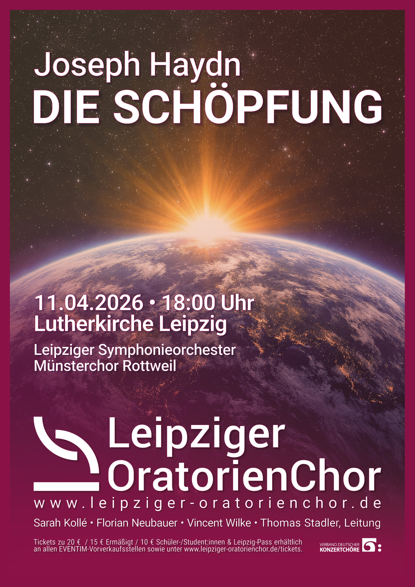 Der Leipziger OratorienChor führt am 11.4.2026, 18:00 in der Lutherkirche gemeinsam mit dem Münsterchor Rottweil und dem Leipziger Symphonieorchester Haydns Schöpfung auf.